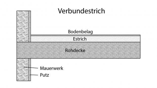 Verbundestrich bietet sich bei hohen mechanischen Belastungen z.B. bei Fahrverkehr und wenn keine besonderen Anforderungen an den Schall- und Wärmeschutz bestehen, an. Im Normalfall bei Wohnungsbauten werden diese Böden in Keller, Nebenräume und Treppenläufe verwendet. Das konstruktive Merkmal ist eine vollflächige und feste Verbundenheit mit dem Untergrund. Die Verbundestriche können ohne weiteren Belag genutzt werden, aber auch eine Belegung ist möglich.